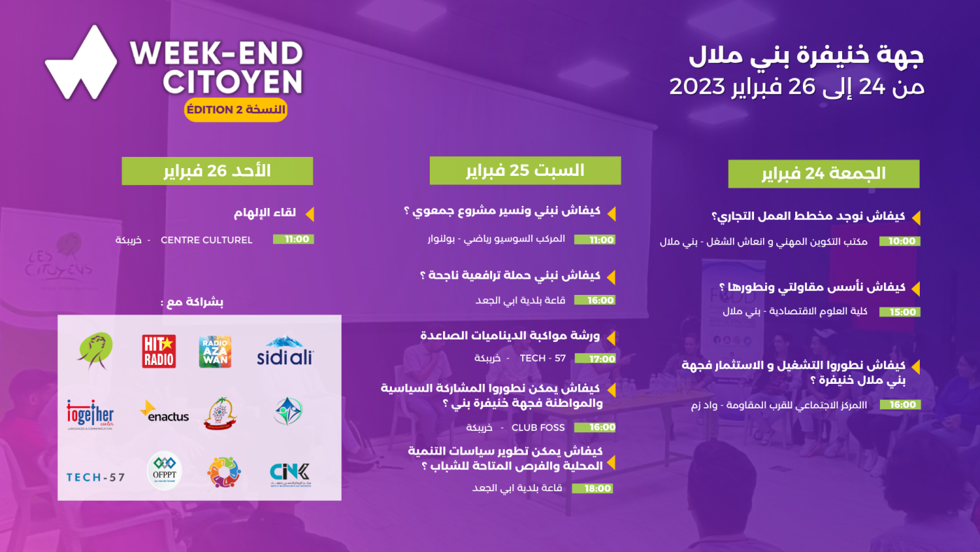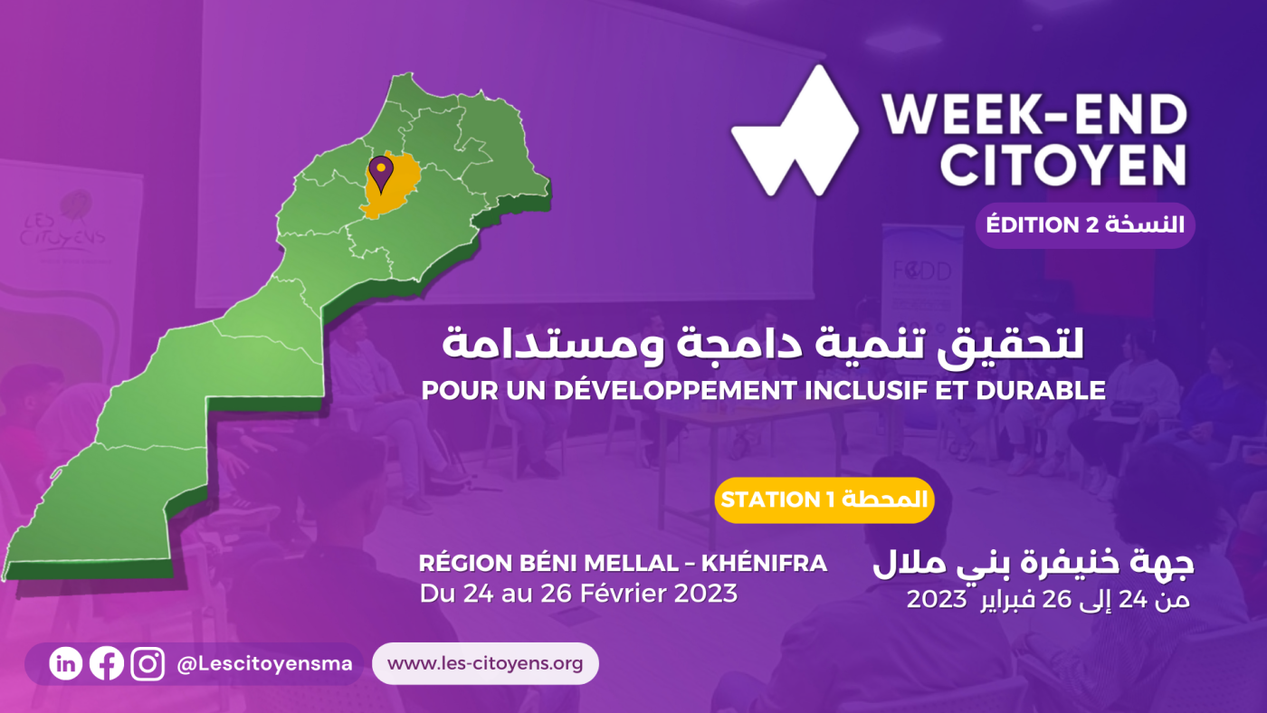 Nous sommes ravis de vous inviter à la 2ème édition de Weekend Citoyen 2023! Nous sommes heureux de vous présenter le programme de la première étape de notre tournée nationale : Région de Béni Mellal-Khénifra.